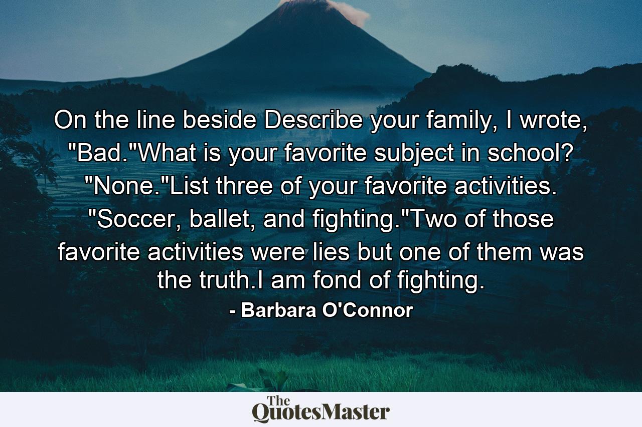 On the line beside Describe your family, I wrote, “Bad.”What is your favorite subject in school? “None.”List three of your favorite activities. “Soccer, ballet, and fighting.”Two of those favorite activities were lies but one of them was the truth.I am fond of fighting.