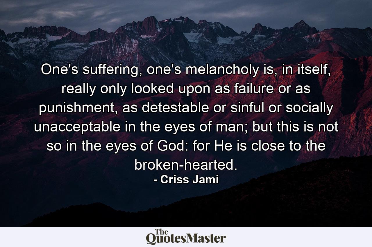 One’s suffering, one’s melancholy is, in itself, really only looked upon as failure or as punishment, as detestable or sinful or socially unacceptable in the eyes of man; but this is not so in the eyes of God: for He is close to the broken-hearted.