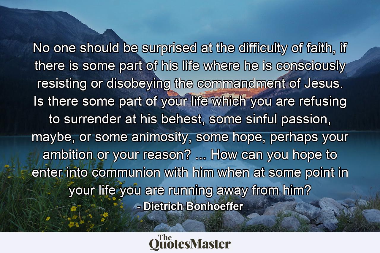 No one should be surprised at the difficulty of faith, if there is some part of his life where he is consciously resisting or disobeying the commandment of Jesus. Is there some part of your life which you are refusing to surrender at his behest, some sinful passion, maybe, or some animosity, some hope, perhaps your ambition or your reason? … How can you hope to enter into communion with him when at some point in your life you are running away from him?