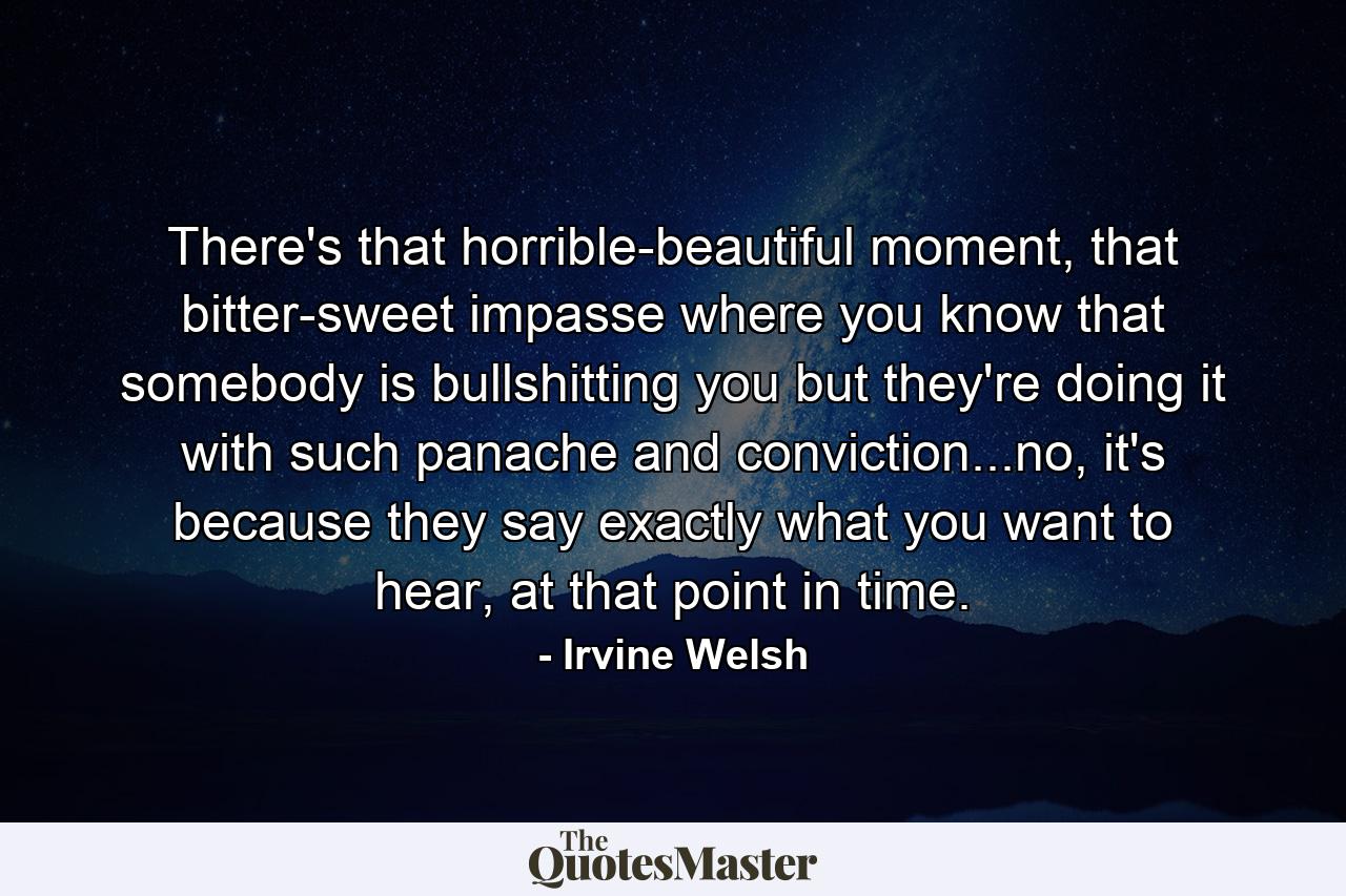 There’s that horrible-beautiful moment, that bitter-sweet impasse where you know that somebody is bullshitting you but they’re doing it with such panache and conviction…no, it’s because they say exactly what you want to hear, at that point in time.