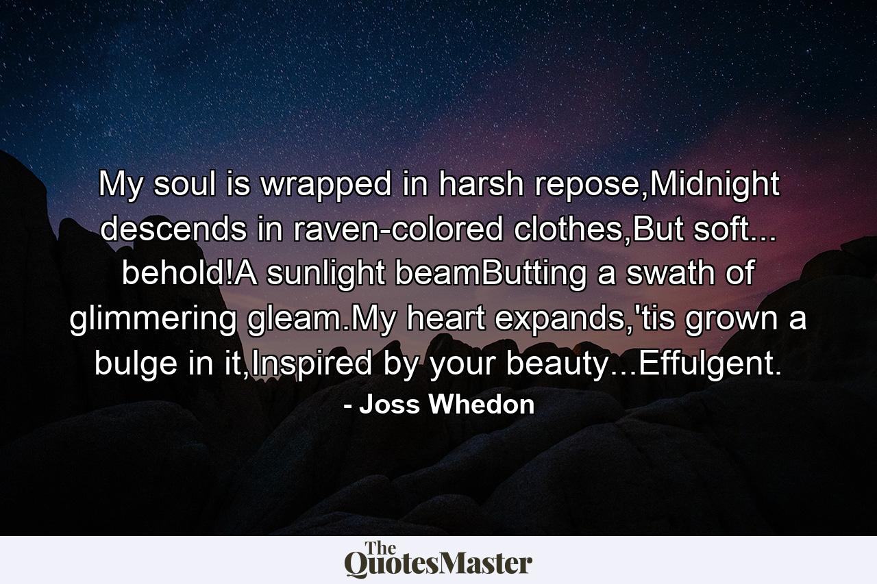My soul is wrapped in harsh repose,Midnight descends in raven-colored clothes,But soft… behold!A sunlight beamButting a swath of glimmering gleam.My heart expands,’tis grown a bulge in it,Inspired by your beauty…Effulgent.