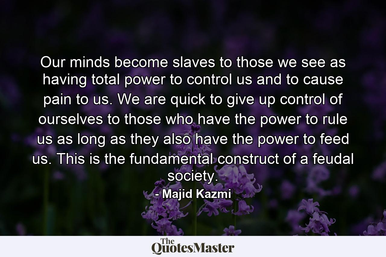 Our minds become slaves to those we see as having total power to control us and to cause pain to us. We are quick to give up control of ourselves to those who have the power to rule us as long as they also have the power to feed us. This is the fundamental construct of a feudal society.