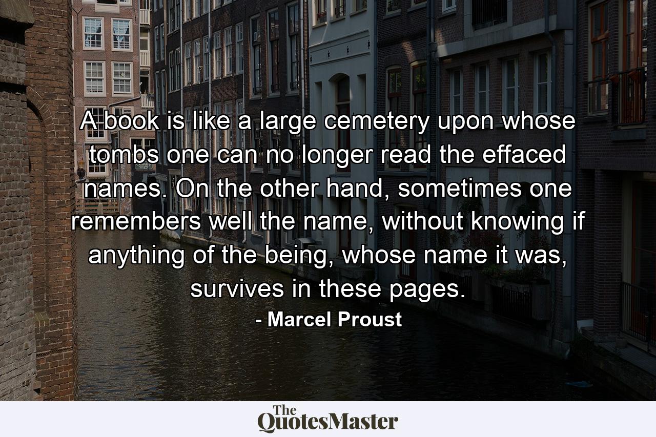 A book is like a large cemetery upon whose tombs one can no longer read the effaced names. On the other hand, sometimes one remembers well the name, without knowing if anything of the being, whose name it was, survives in these pages.