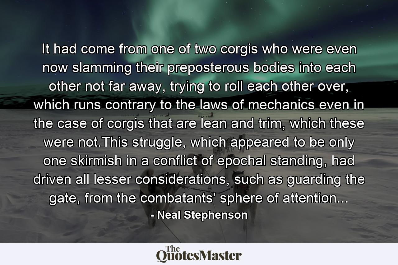 It had come from one of two corgis who were even now slamming their preposterous bodies into each other not far away, trying to roll each other over, which runs contrary to the laws of mechanics even in the case of corgis that are lean and trim, which these were not.This struggle, which appeared to be only one skirmish in a conflict of epochal standing, had driven all lesser considerations, such as guarding the gate, from the combatants’ sphere of attention…