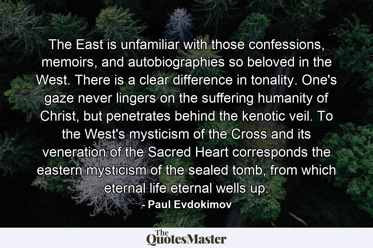The East is unfamiliar with those confessions, memoirs, and autobiographies so beloved in the West. There is a clear difference in tonality. One’s gaze never lingers on the suffering humanity of Christ, but penetrates behind the kenotic veil. To the West’s mysticism of the Cross and its veneration of the Sacred Heart corresponds the eastern mysticism of the sealed tomb, from which eternal life eternal wells up.