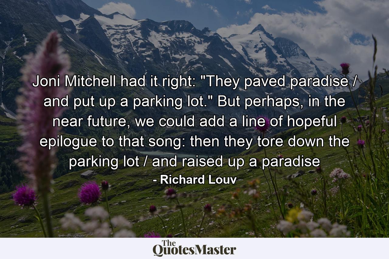 Joni Mitchell had it right: “They paved paradise / and put up a parking lot.” But perhaps, in the near future, we could add a line of hopeful epilogue to that song: then they tore down the parking lot / and raised up a paradise