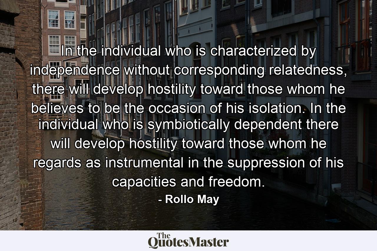 In the individual who is characterized by independence without corresponding relatedness, there will develop hostility toward those whom he believes to be the occasion of his isolation. In the individual who is symbiotically dependent there will develop hostility toward those whom he regards as instrumental in the suppression of his capacities and freedom.