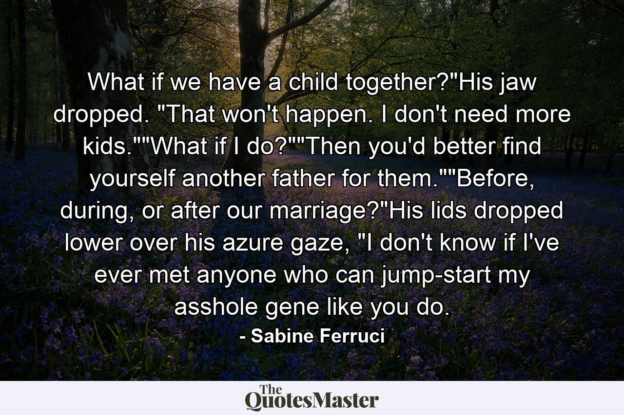What if we have a child together?”His jaw dropped. “That won’t happen. I don’t need more kids.””What if I do?””Then you’d better find yourself another father for them.””Before, during, or after our marriage?”His lids dropped lower over his azure gaze, “I don’t know if I’ve ever met anyone who can jump-start my asshole gene like you do.