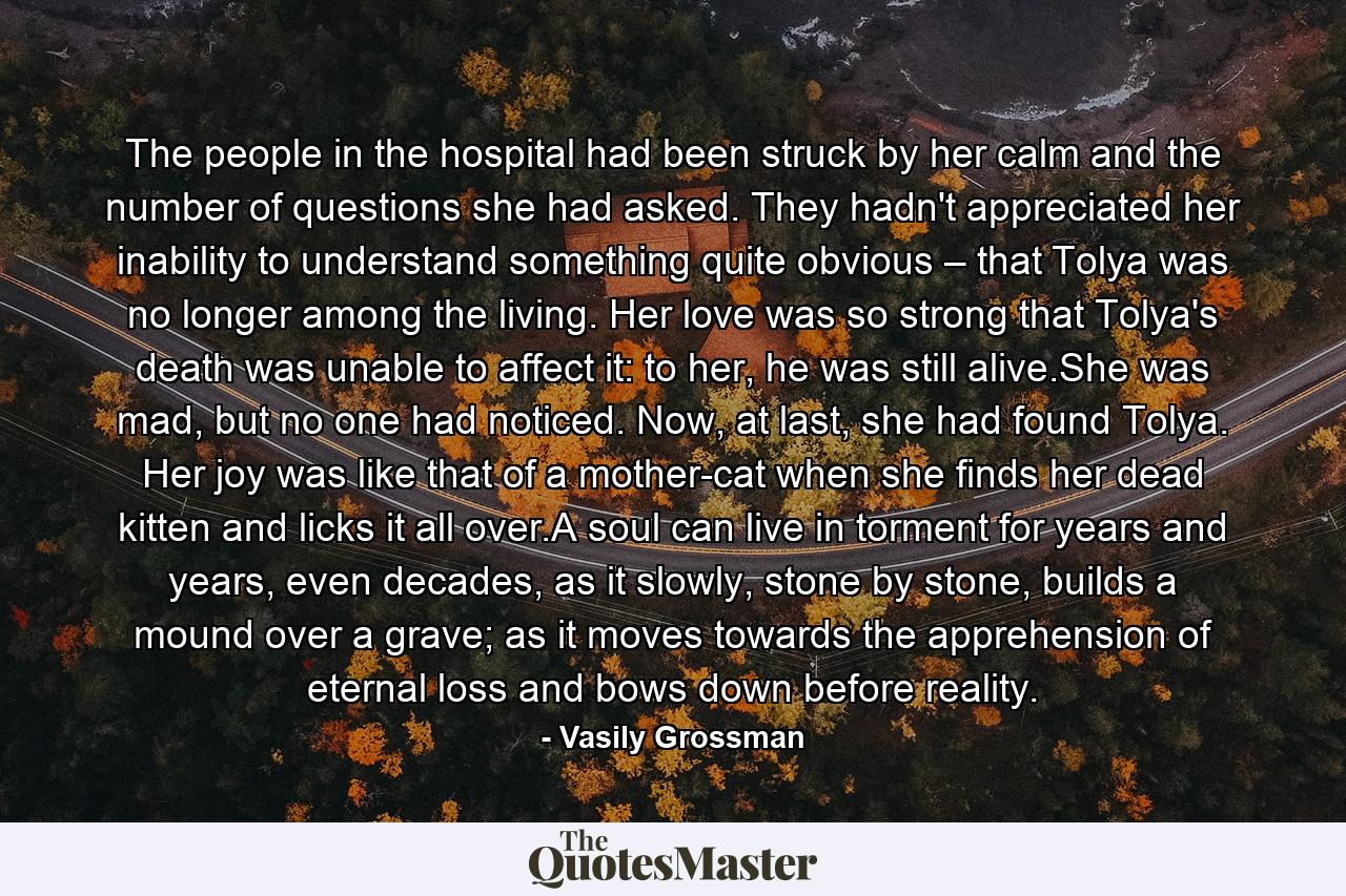 The people in the hospital had been struck by her calm and the number of questions she had asked. They hadn’t appreciated her inability to understand something quite obvious – that Tolya was no longer among the living. Her love was so strong that Tolya’s death was unable to affect it: to her, he was still alive.She was mad, but no one had noticed. Now, at last, she had found Tolya. Her joy was like that of a mother-cat when she finds her dead kitten and licks it all over.A soul can live in torment for years and years, even decades, as it slowly, stone by stone, builds a mound over a grave; as it moves towards the apprehension of eternal loss and bows down before reality.