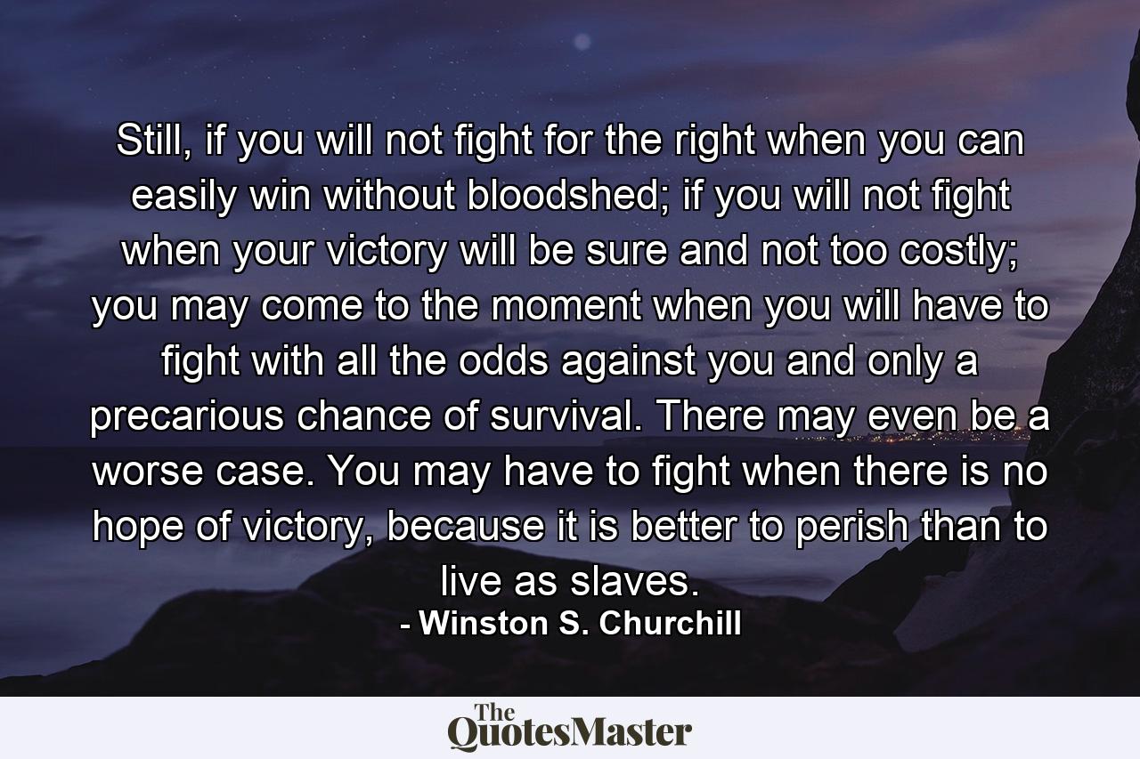 Still, if you will not fight for the right when you can easily win without bloodshed; if you will not fight when your victory will be sure and not too costly; you may come to the moment when you will have to fight with all the odds against you and only a precarious chance of survival. There may even be a worse case. You may have to fight when there is no hope of victory, because it is better to perish than to live as slaves.